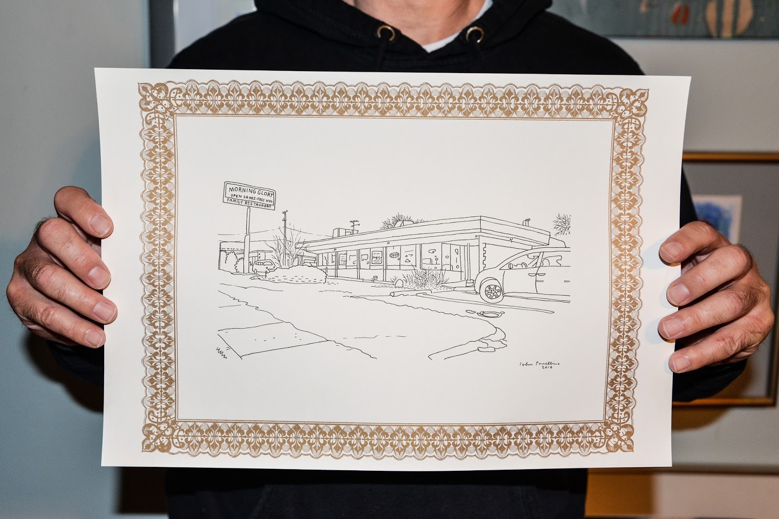 Morning Glory Restaurant, Machesney Park, IllinoisBlack ink on gold embossed paper, 8.5" x 11"Unlimited edition
