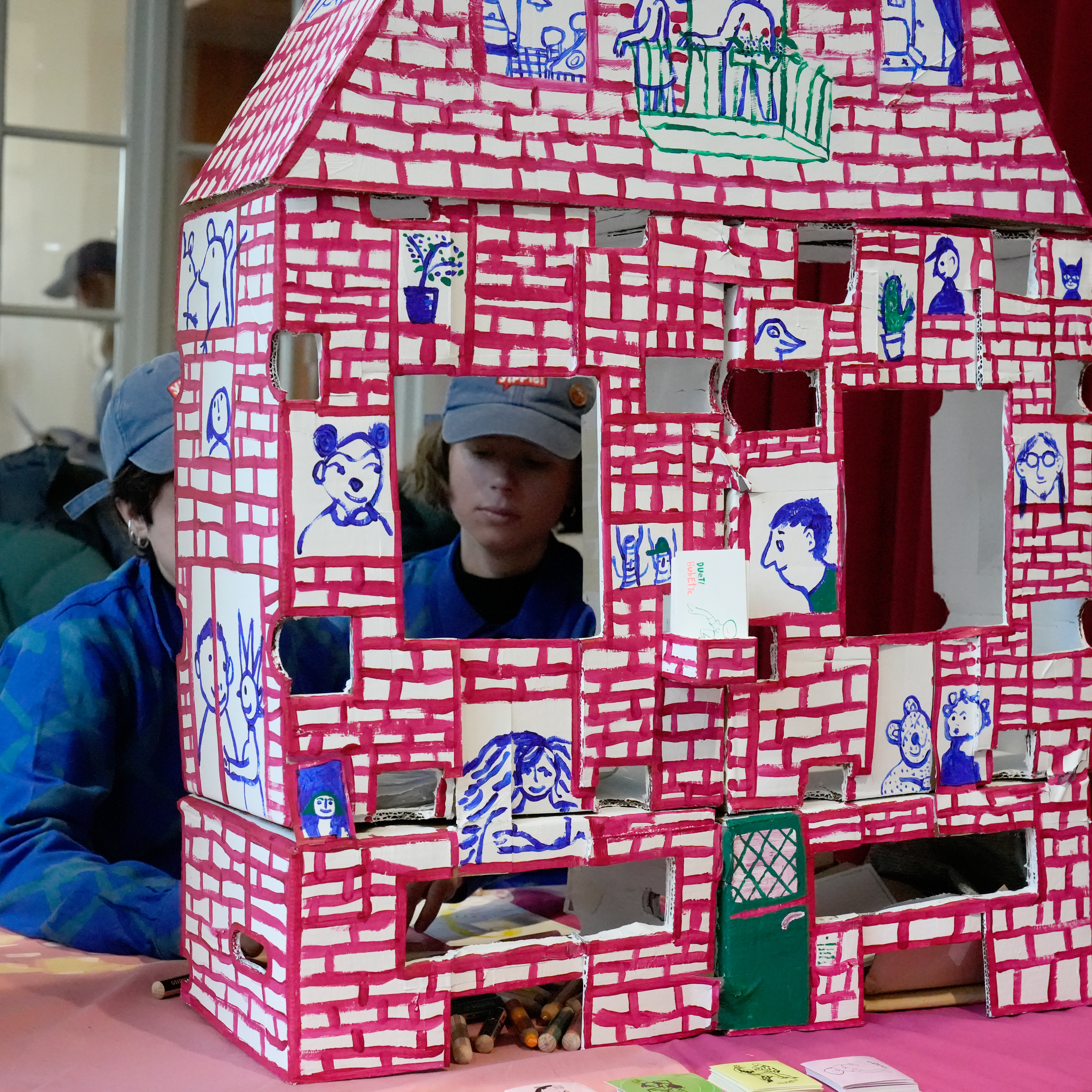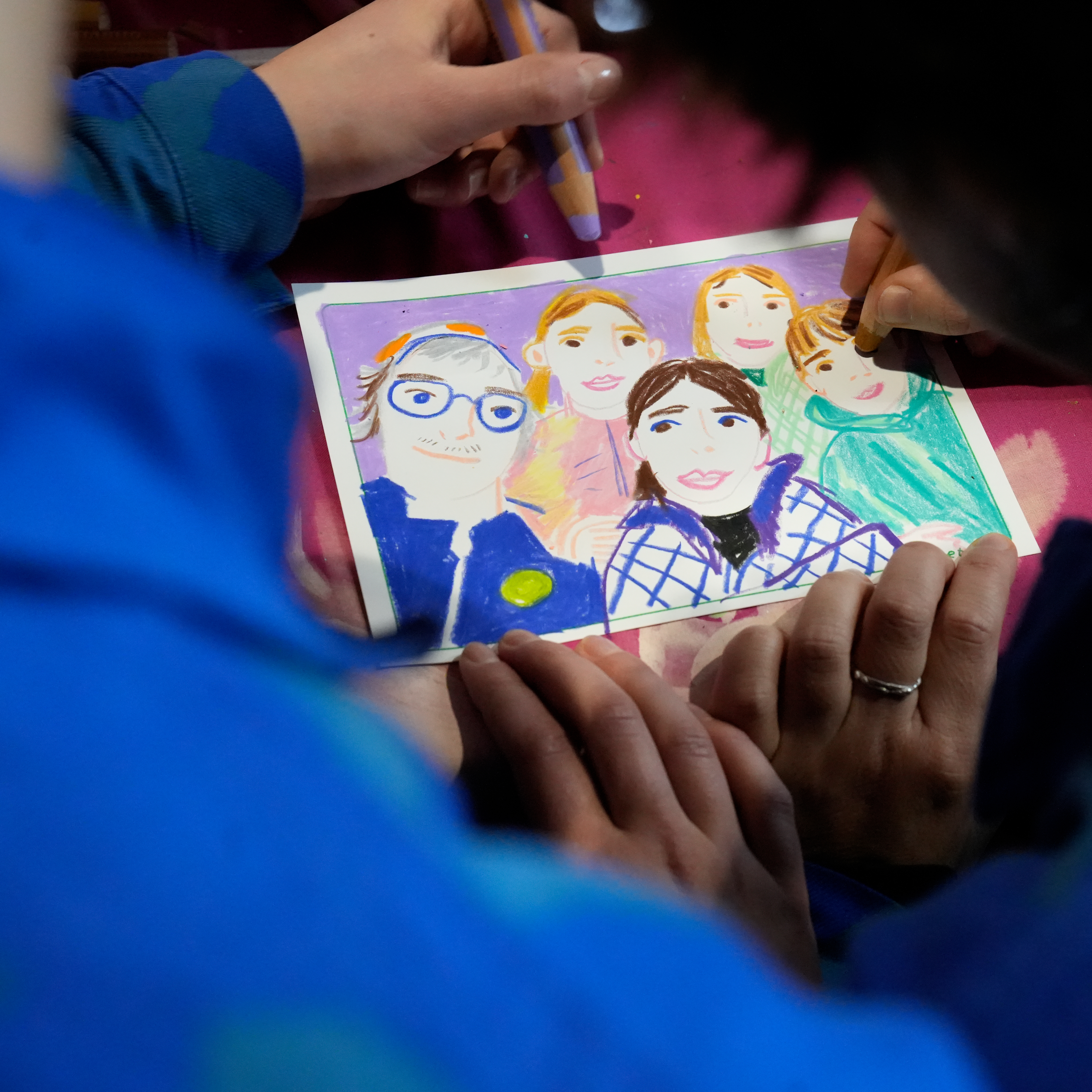 Une performance amusante où, concentré·es, iels réalisent des illustrations à « deux mains ». Jill Pastore avec la droite, Helena Baumeister avec la gauche. Installé·es dans leur machine à dessiner multicolore, iels accomplissent en quelques minutes des portraits de familles nombreuses, d’animaux, d’individus seuls ou de personnes absentes à partir de descriptions, de récits ou de photos.