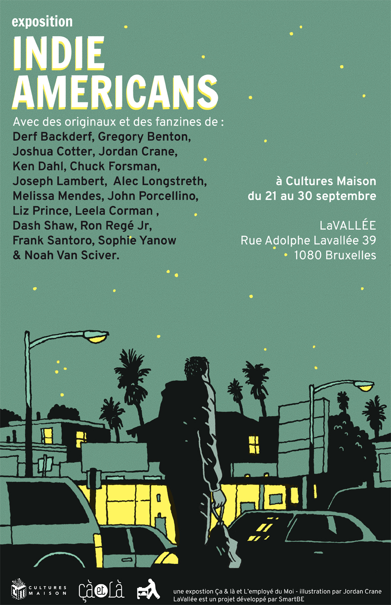 Des planches de l’auteur de The End of The Fucking World et de Pauvre Sydney ! seront accrochées lors de l’exposition Indie Americans de l’employé du Moi et les Éditions Çà et Là coproduite par le festival Cultures Maison. Mais ce n’est pas tout ! Vous pourrez découvrir durant cette exposition le travail d’une partie des auteur.e.s de la jeune garde américaine. Parmi lesquels : Ken Dahl, Chuck Forsman, Joseph Lambert, Alec Longstreth, John Porcellino, Ron Regé Jr, Noah Van Sciver et Jordan Crane, qui signe l’affiche. Mais, aussi, des œuvres des auteurs du catalogue Çà et Là (Derf Backderf, Gregory Benton, Leela Corman, Joshua Cotter, Liz Prince, Frank Santoro, Dash Shaw) ainsi que de jeunes artistes (Melissa Mendes, Sophie Yanow) qui n’ont pas encore été publiés en français, mais pourraient bien l’être un de ces quatre.