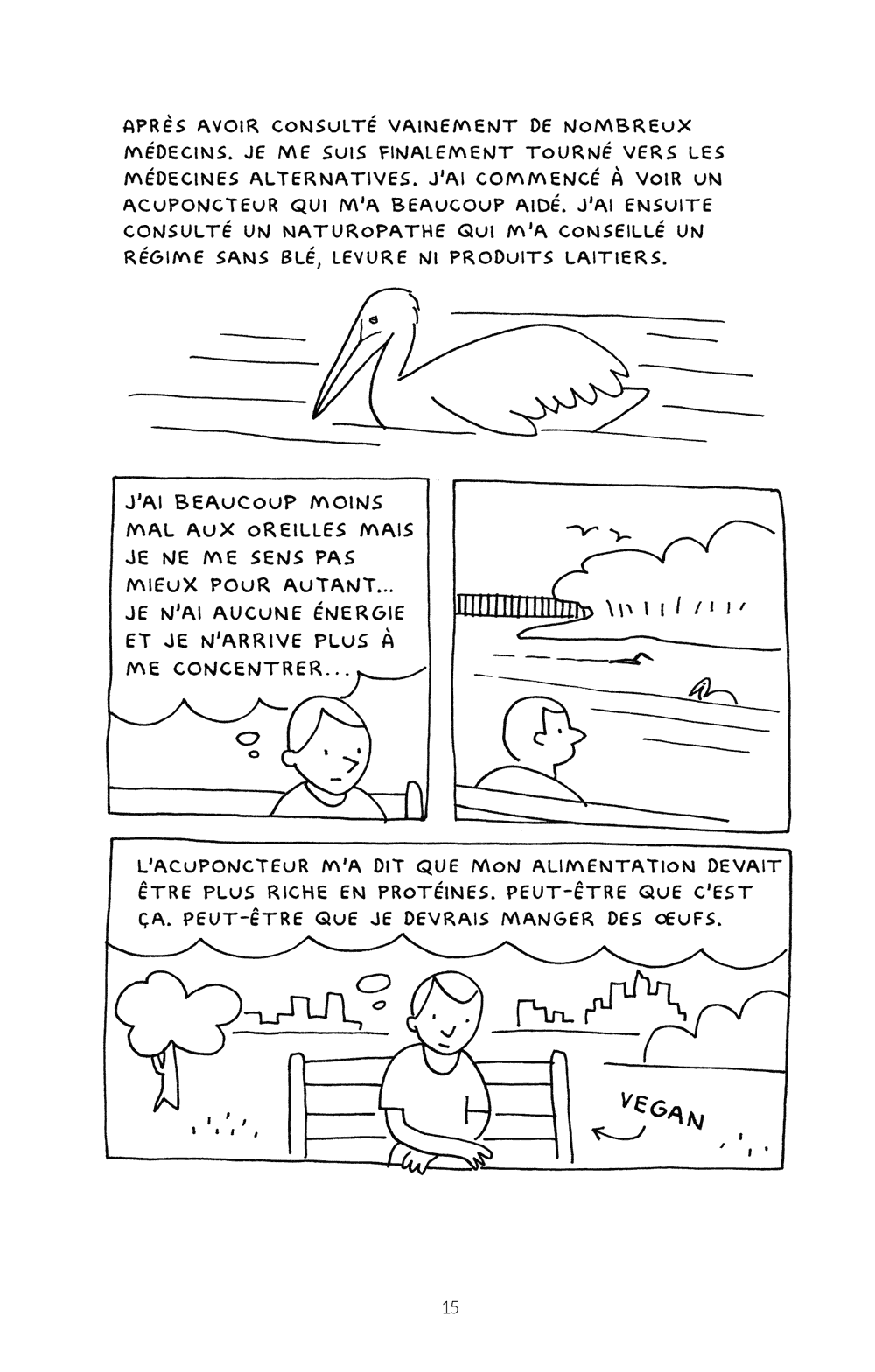 Acteur incontournable de la scène indépendante américaine avec son fanzine King-Cat, Porcellino narre son calvaire comme à son habitude au moyen d’un style épuré, poétique et sensible. La bande dessinée est son deuxième langage, l’autobiographie la matérialisation inévitable de ses maux. Il n’a jamais perdu l’envie de raconter. C’est une seconde nature pour lui, c’en est presque pathologique !