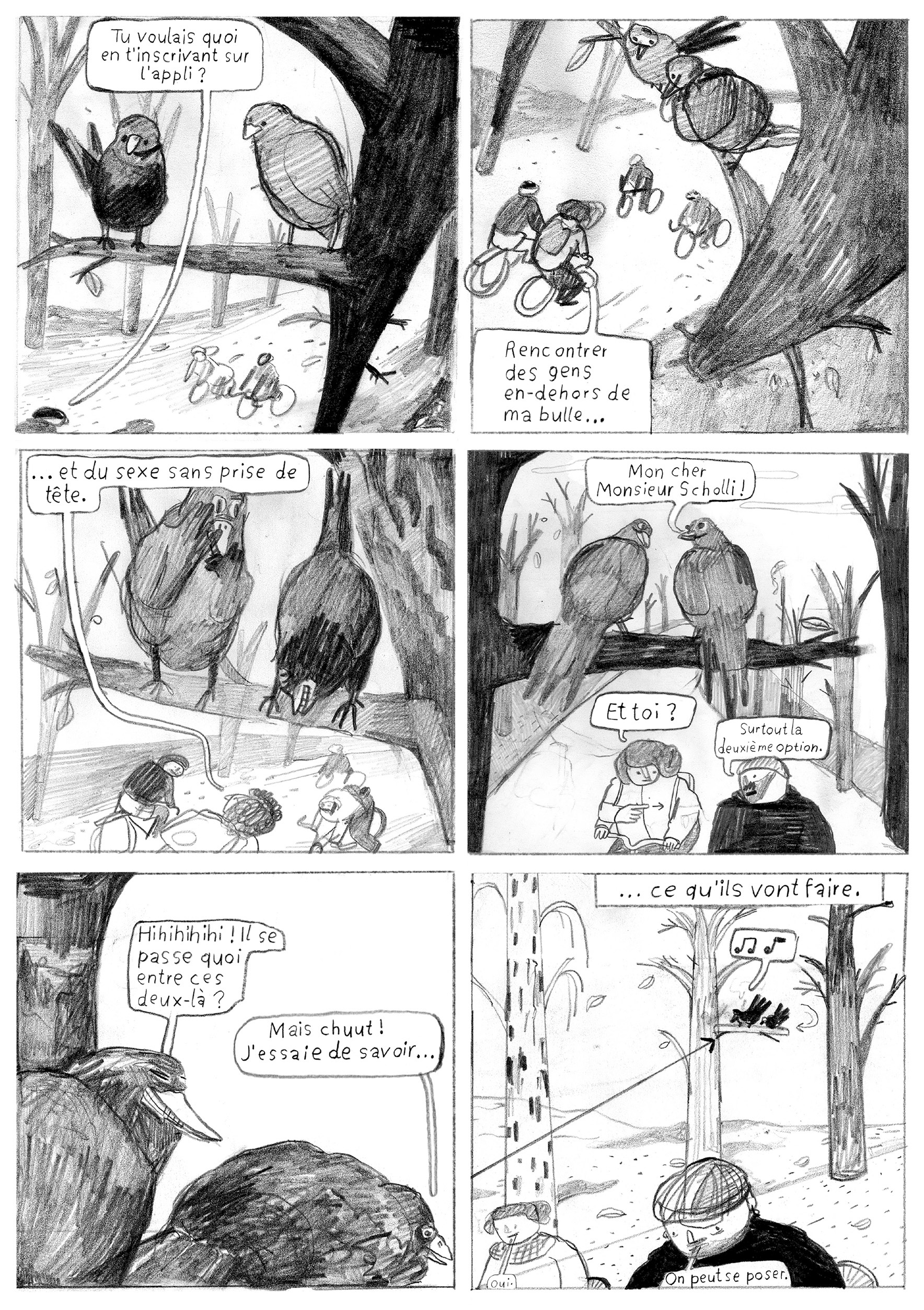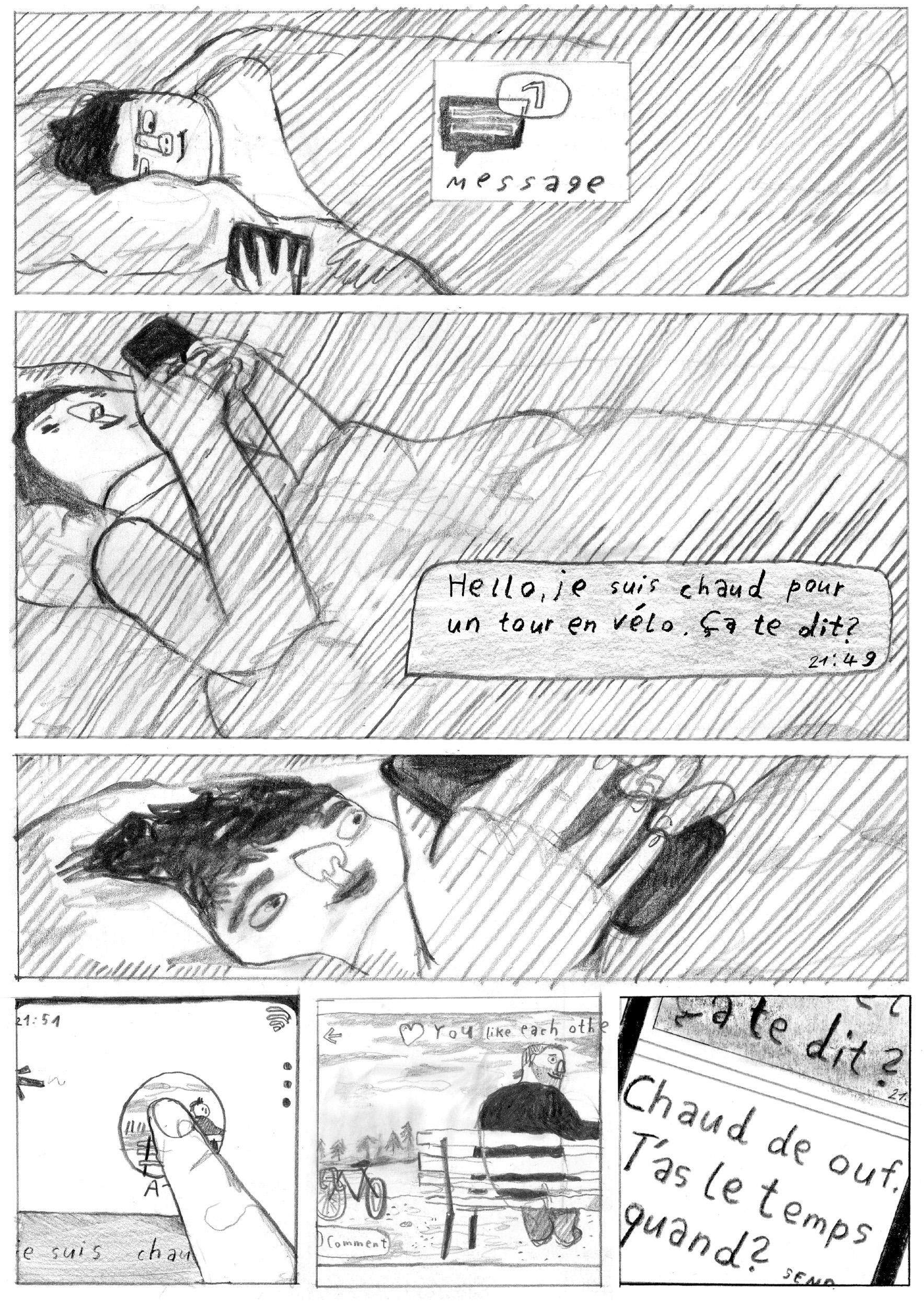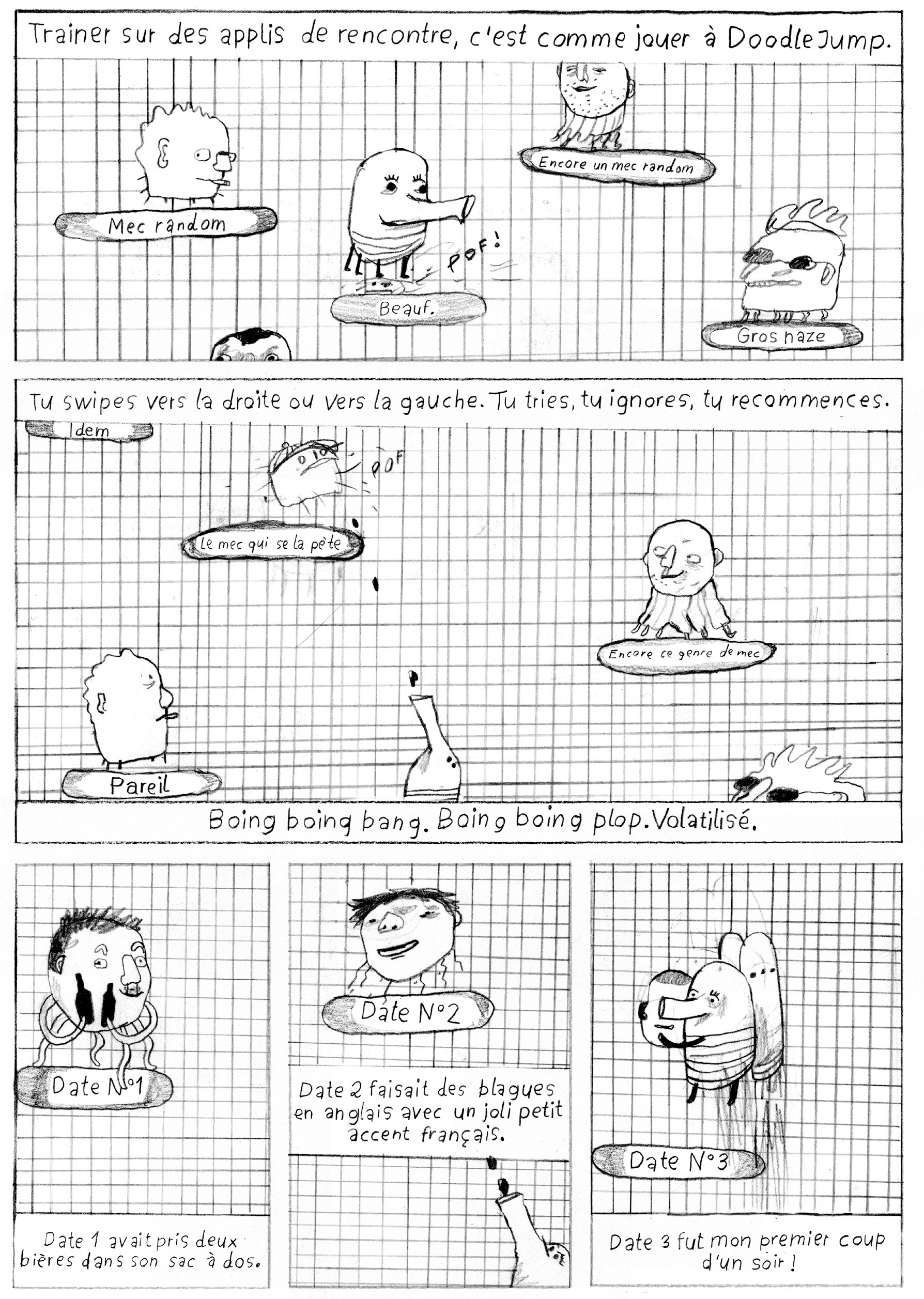 Oh Cupid nous invite dans l’intimité de l’autrice et nous témoigne avec autodérision comment séduction rime parfois avec vulnérabilité, excitation avec maladresse. Dans ce jeu de rôles où personne n’est dupes et où il s’agit de ne surtout pas tomber amoureux, Helena doit se montrer impassible tout en donnant l’impression d’être naturelle. Ses tentatives de plaire tombent tellement à plat qu’elle s’enfonce de plus en plus dans l’embarras. On le sait, l’entremise numérique peut parfois induire un certain nombre de désillusions et de relations sans lendemain. Avec le recul, elle s’autorise même à badiner avec l’amour. Helena Baumeister détonne avec sa façon bien à elle de rendre compte de ses émotions et sentiments à l’aide d’un style graphique aussi charbonné que vivant. Avec ce premier livre, la jeune autrice hambourgeoise avance une narration libérée sur la sexualité et l’amour d’aujourd’hui.