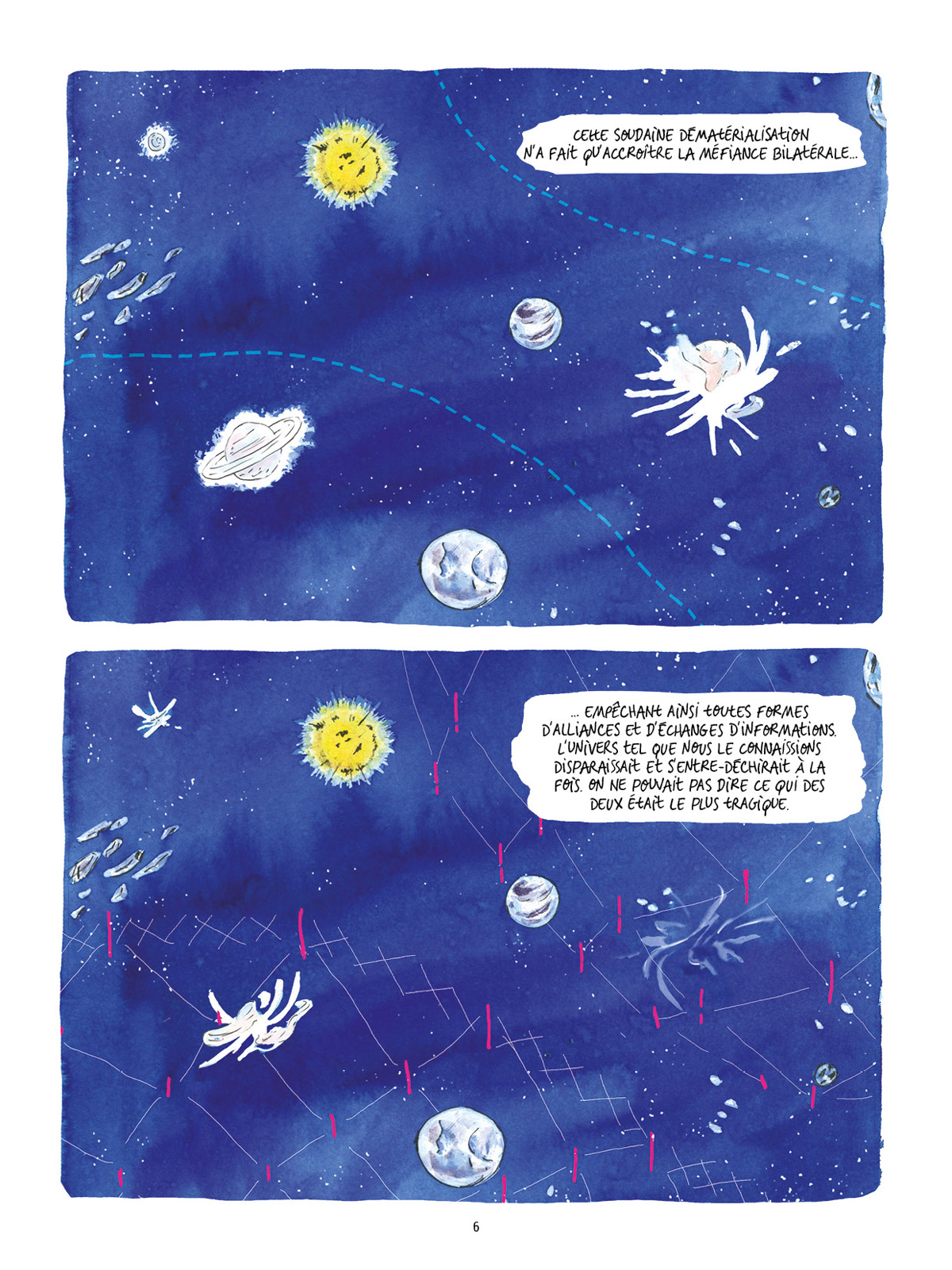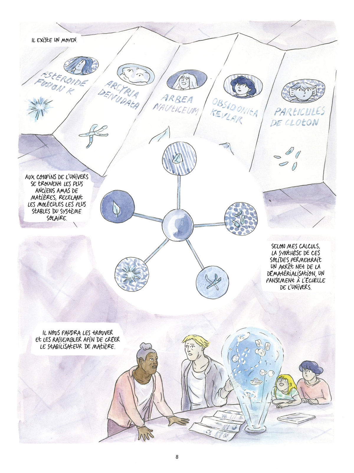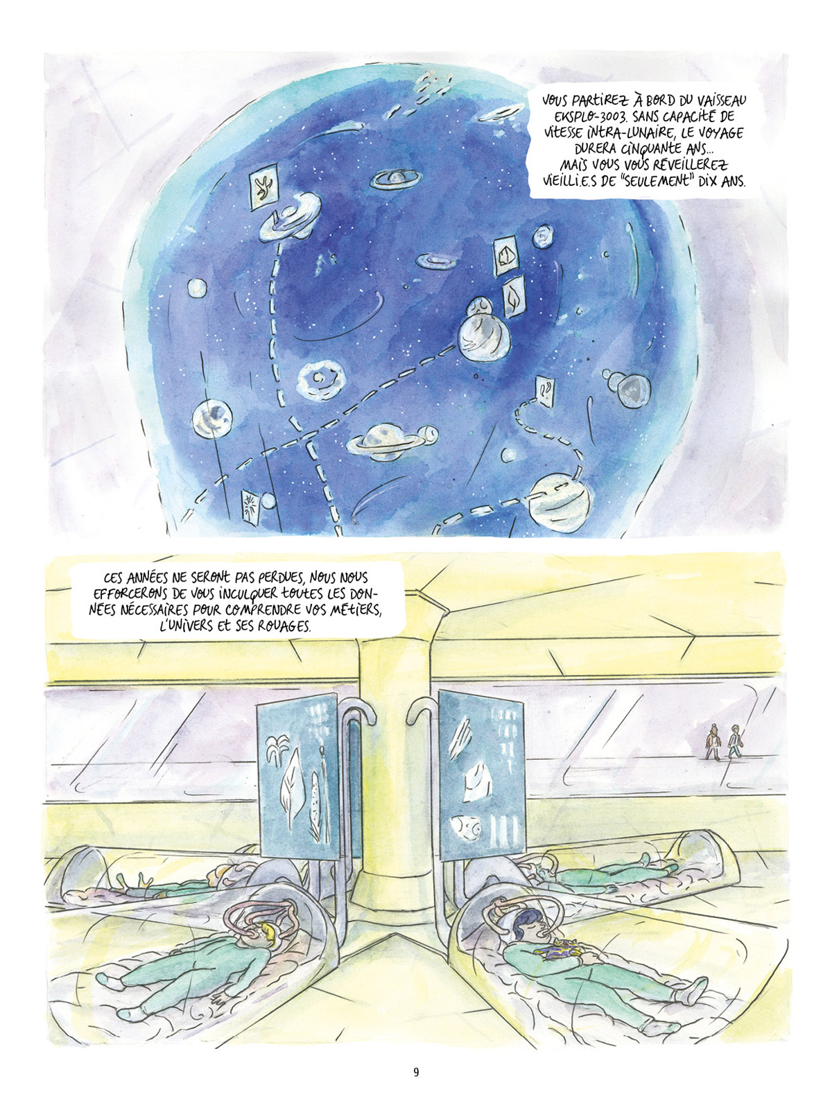Julie Michelin est une jeune autrice parisienne. Passée par Les Arts-Déco de Strasbourg et L’EESI d’Angoulême, elle occupe aujourd’hui une place à la Villa Belleville où elle y anime, entre autres choses, des ateliers de sérigraphie. Lorsqu’elle ne dessine pas, elle participe à l’organisation d’évènements tels que le festival OFF d’Angoulême ou Fanzines ! à Paris. C’est dans le cadre de ce dernier festival que son travail tape dans l’oeil des éditeurs de L’employé du moi grâce à Obsidienne Magnétite (Le Mégot Éditions, 2014). Dans ce fanzine en risographie, elle y déployait un univers graphique fantasmagorique, tout aussi organique que minéralogique, et mettait en scène des protagonistes explorateurs qui n’ont pas froid aux yeux. En quelques pages, cette petite bande dessinée préfigurait déjà les thématiques d’Eksploracja, son premier récit d’envergure.