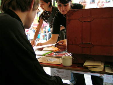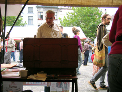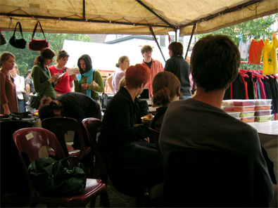 C’est le 10 et 11 septembre, sur la place Sainte Catherine, que c’est déroulé le premier marché beaubeau. A condition de produire à peu d’exmplaire, quiconque est le bienvenu pour y présenter son travail. Que ce soit en graphisme, artisanat, à condition d’y présenter quelque chose de neuf et personnel. Nos vieux comparces d’Habeas Corpus nous ont proposé d’ y participer avec eux. Le cadre était agréable. Pour la musique, la carte blanche a été donnée au label Matamore, ce qui assurait une qualité et une faîcheur. Notament avec V.O. Ou encore Raymondo. Les liégeois de House Dance, Trance Acid, Underground Techno & Hardcore nous ont offert une musique toutes Mycosienne... Et puis il ne faut pas oublier le temps (puisque nous sommes en Belgique). Le samedi a été une journée qui a battu les records d’intensité en pluie. Dans la soirée, on a découvert à Bruxelles, que nous avions des rues torrents, un tunnel piscine couverte et une station de métro fontaine géante... Quant à nous, nous nous sommes réfugiés au célèbre "Choux de Bruxelles", restaurant typiquement bruxellois. Nous y avons mangé des moules nature et du stoemp, évidement ! Voilà pour clort l’été pourri.
