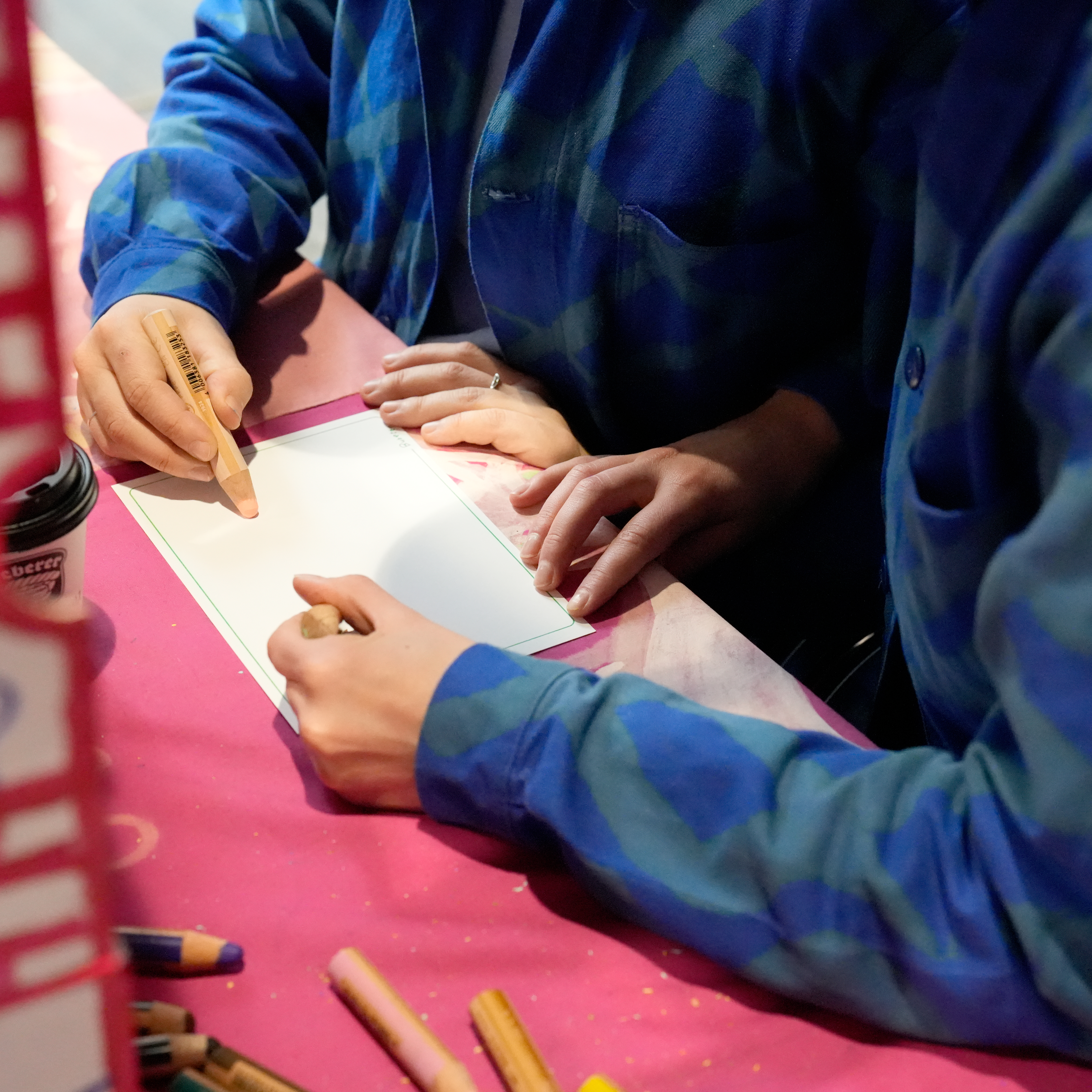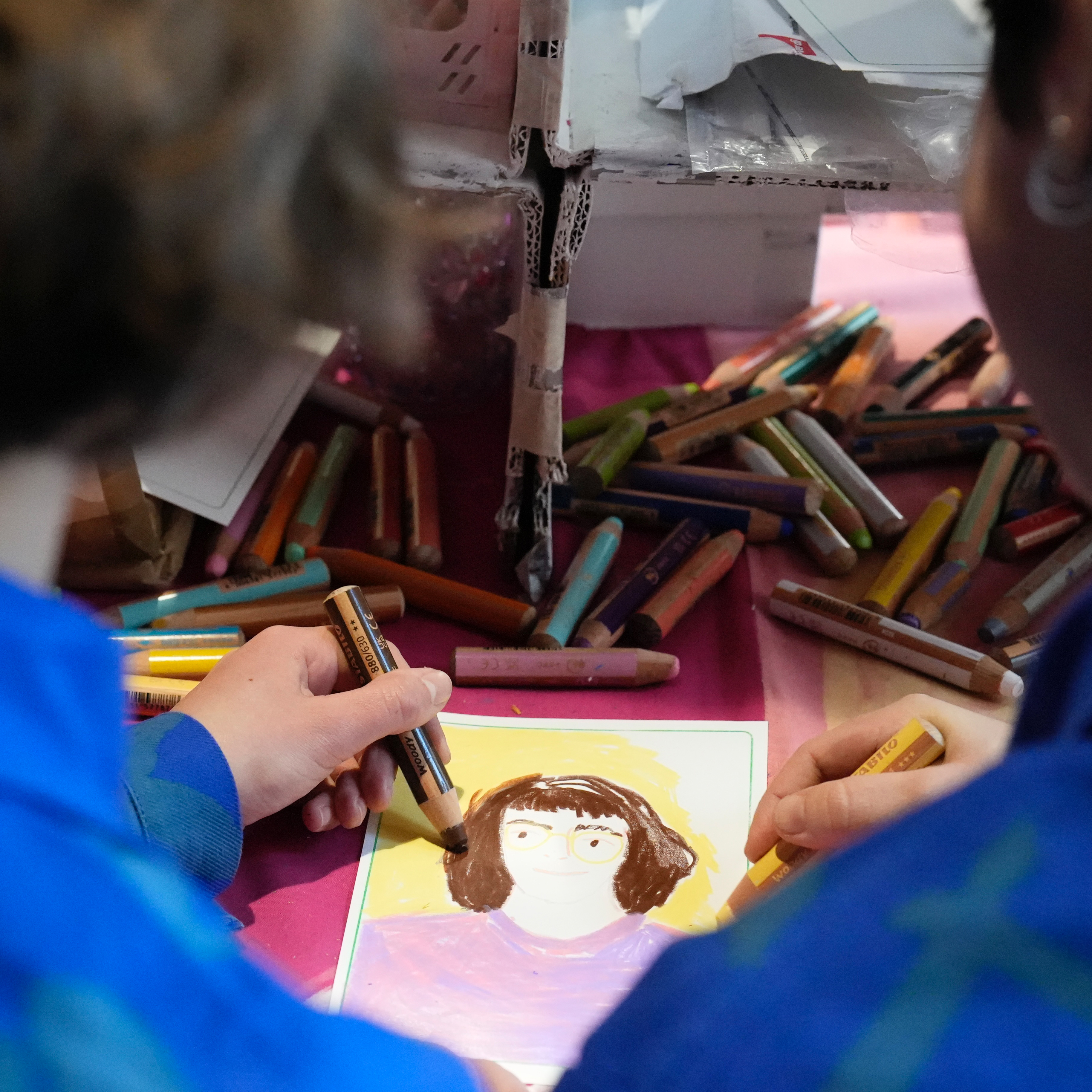 Une performance amusante où, concentré·es, iels réalisent des illustrations à « deux mains ». Jill Pastore avec la droite, Helena Baumeister avec la gauche. Installé·es dans leur machine à dessiner multicolore, iels accomplissent en quelques minutes des portraits de familles nombreuses, d’animaux, d’individus seuls ou de personnes absentes à partir de descriptions, de récits ou de photos.